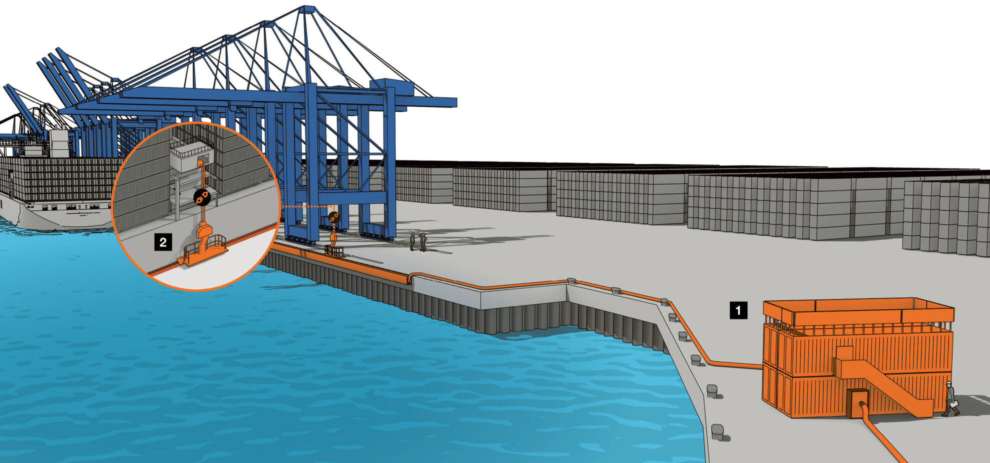 The electricity from the public grid must be converted in a transformer station (1) before it can be used by ships via a huge, mobile “socket” (2).