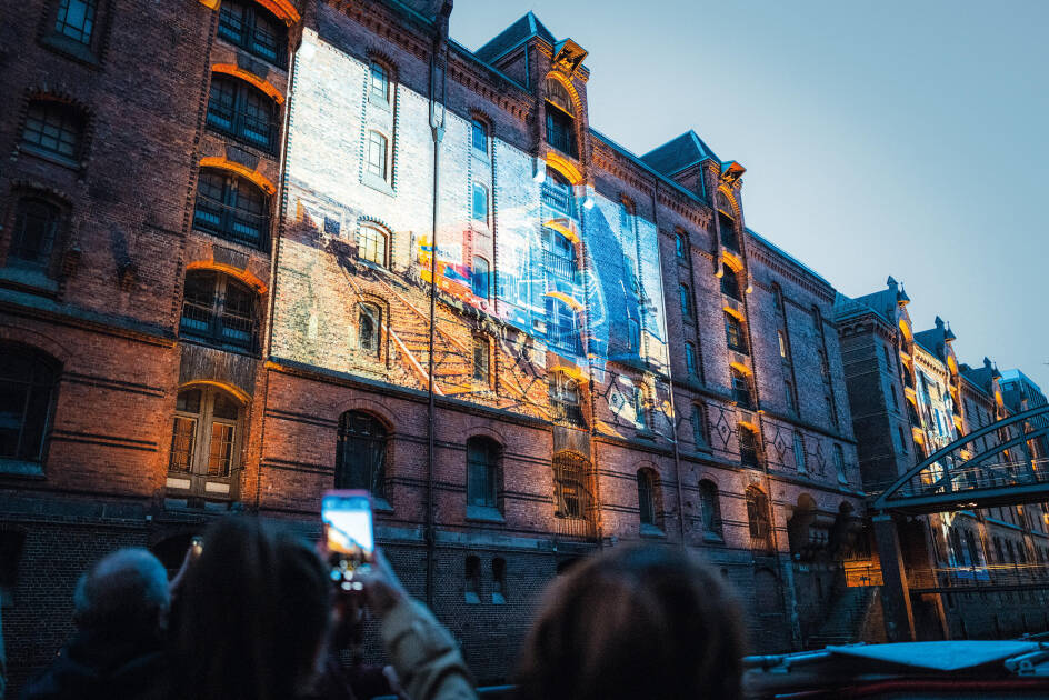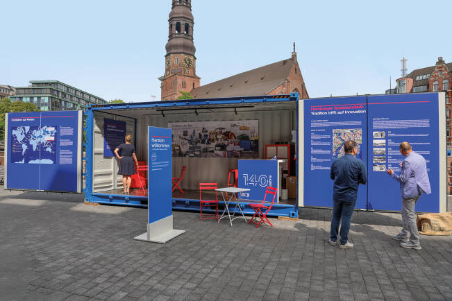 Celebrations: In 2025, HHLA hosted a series of high-profile events to celebrate a decade as a World Heritage Site. Among others, a barge sailed through the spectacularly illuminated canals. On the Zollkanal promenade, our show container invited the public to explore the fascinating history of the Speicherstadt.