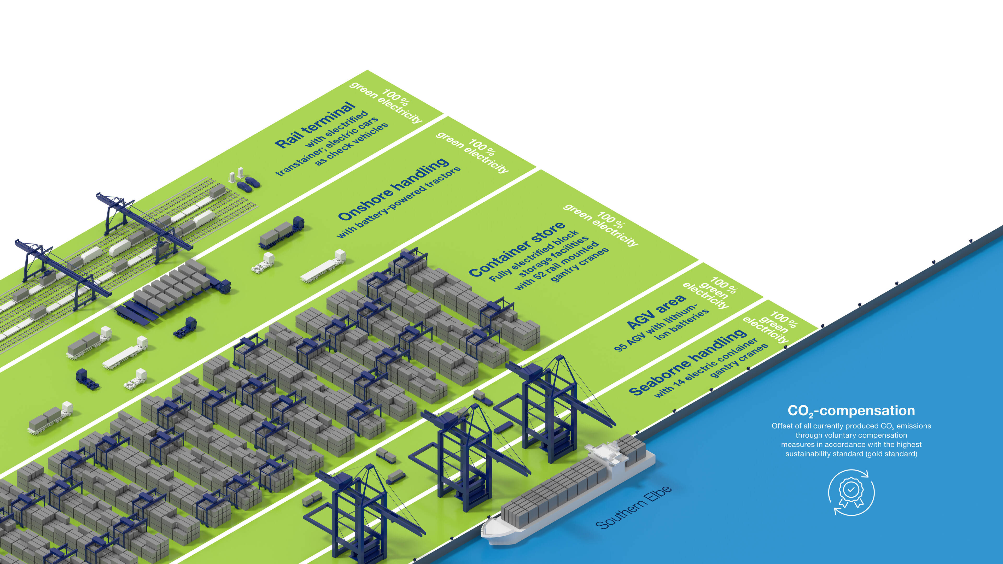 The illustration shows how almost all areas of the terminal have now been electrified. This is the basis for operating the facility’s handling and transport resources and all other equipment using only green electricity. However, this only relates to our own technology. The trucks and shunting locomotives belonging to our clients and partners are beyond our direct control. Some of the onshore processes have not yet been completely changed over as manufacturers of special vehicles continue to convert and test their product lines – in some cases in close cooperation with HHLA.